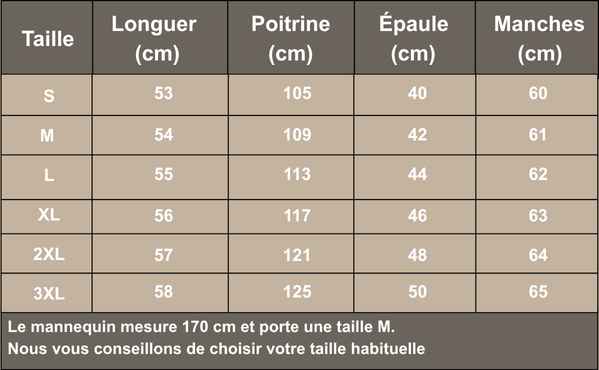 LA VESTE TAILLE NORMAL – Nous vous recommandons de choisir votre taille habituelle.